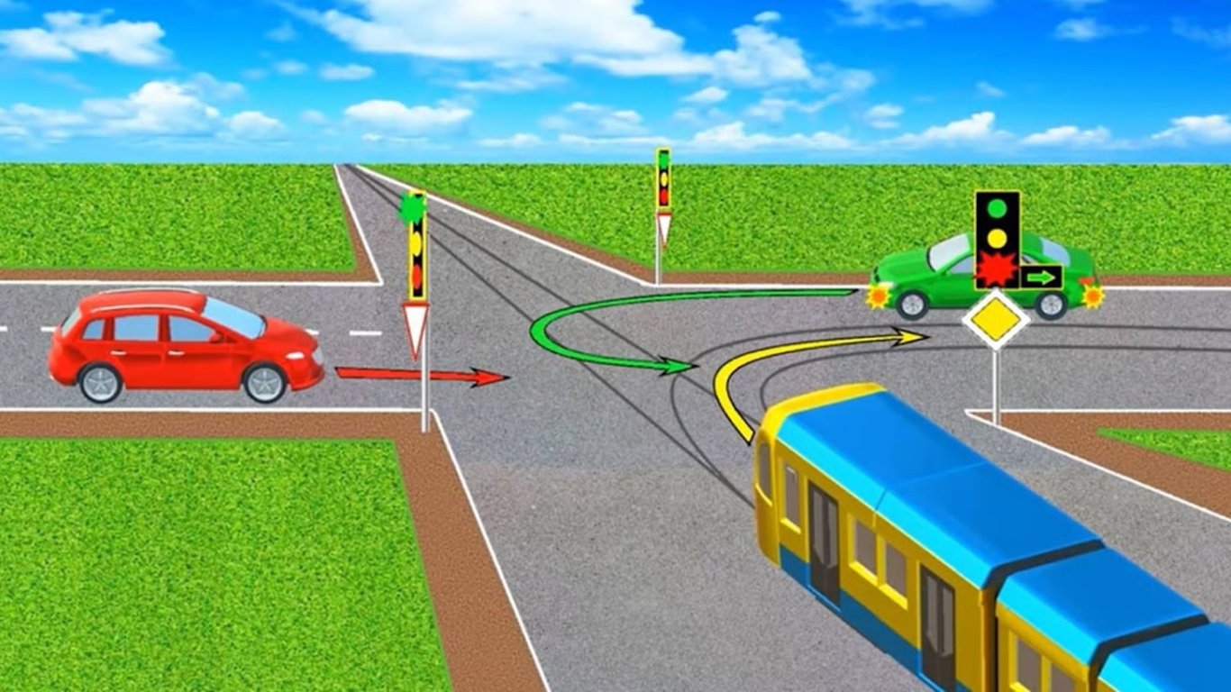Водії усіх транспортних засобів можуть продовжити рух, позаяк легковим автомобілям горить основний зелений сигнал світлофора, а трамваю — основний червоний, але стрілочка в додатковій секції дозволяє виконати поворот праворуч.