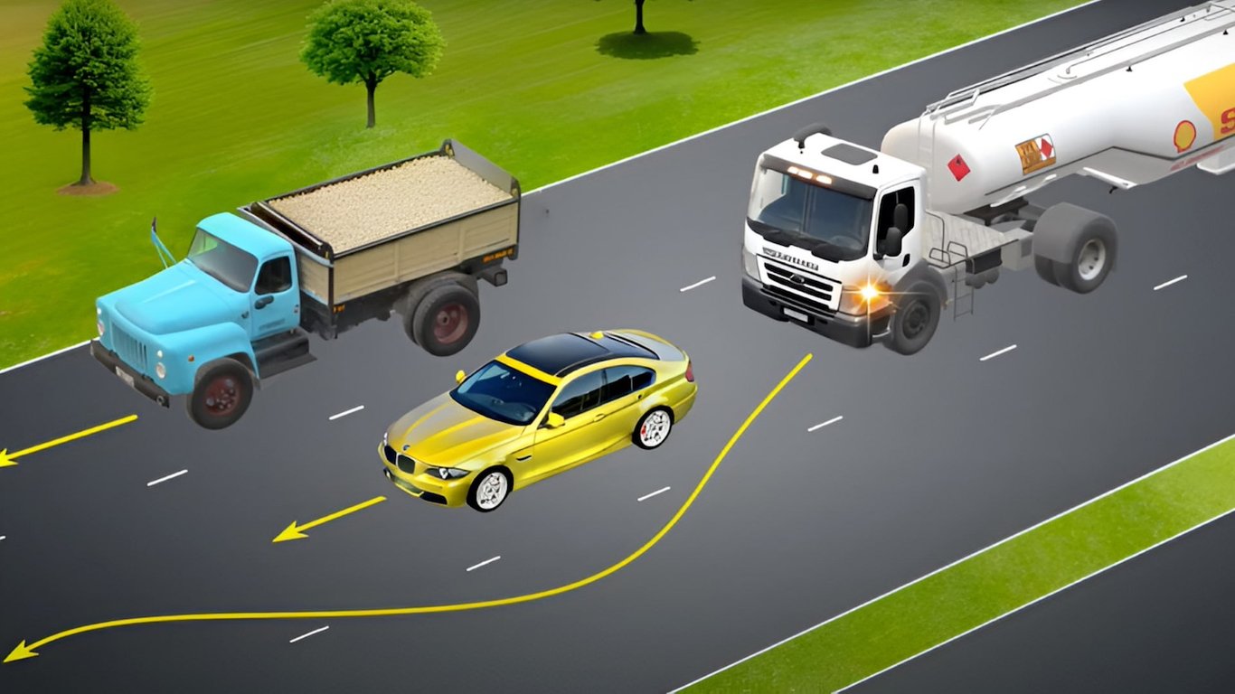 На трасі з трьома смугами руху водій вантажівки їде правою смугою, водій жовтого легковика — середньою. А водій бензовоза має намір випередити жовту машину, виїхавши на ліву смугу.