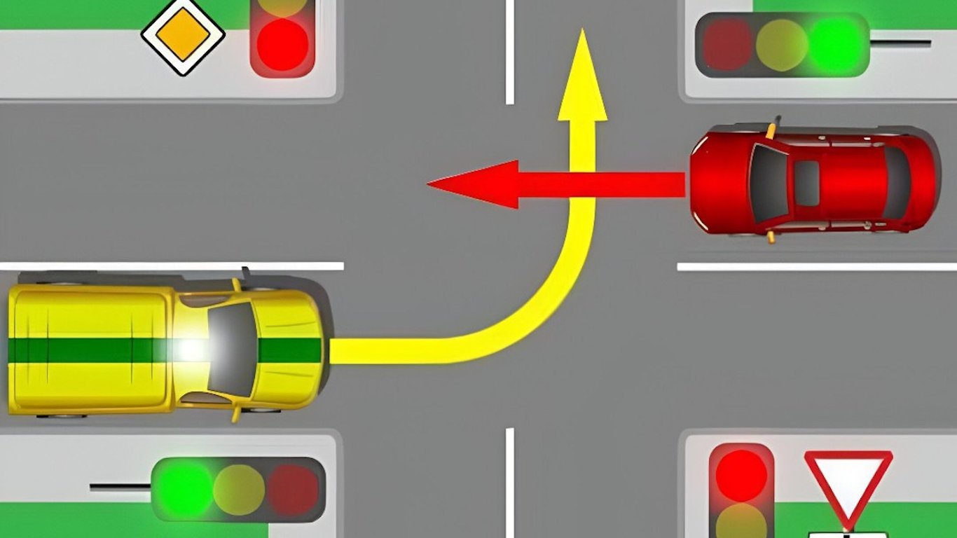 Обидва водії проїжджають на зелений сигнал світлофора, але поступитися має інкасатор, адже він повертає ліворуч.
