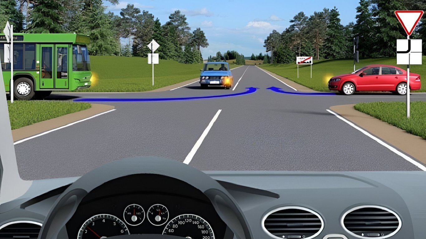 На перехресті автобус та синій автомобіль повертають ліворуч, червона машина повертає праворуч, а ви проїжджаєте прямо.