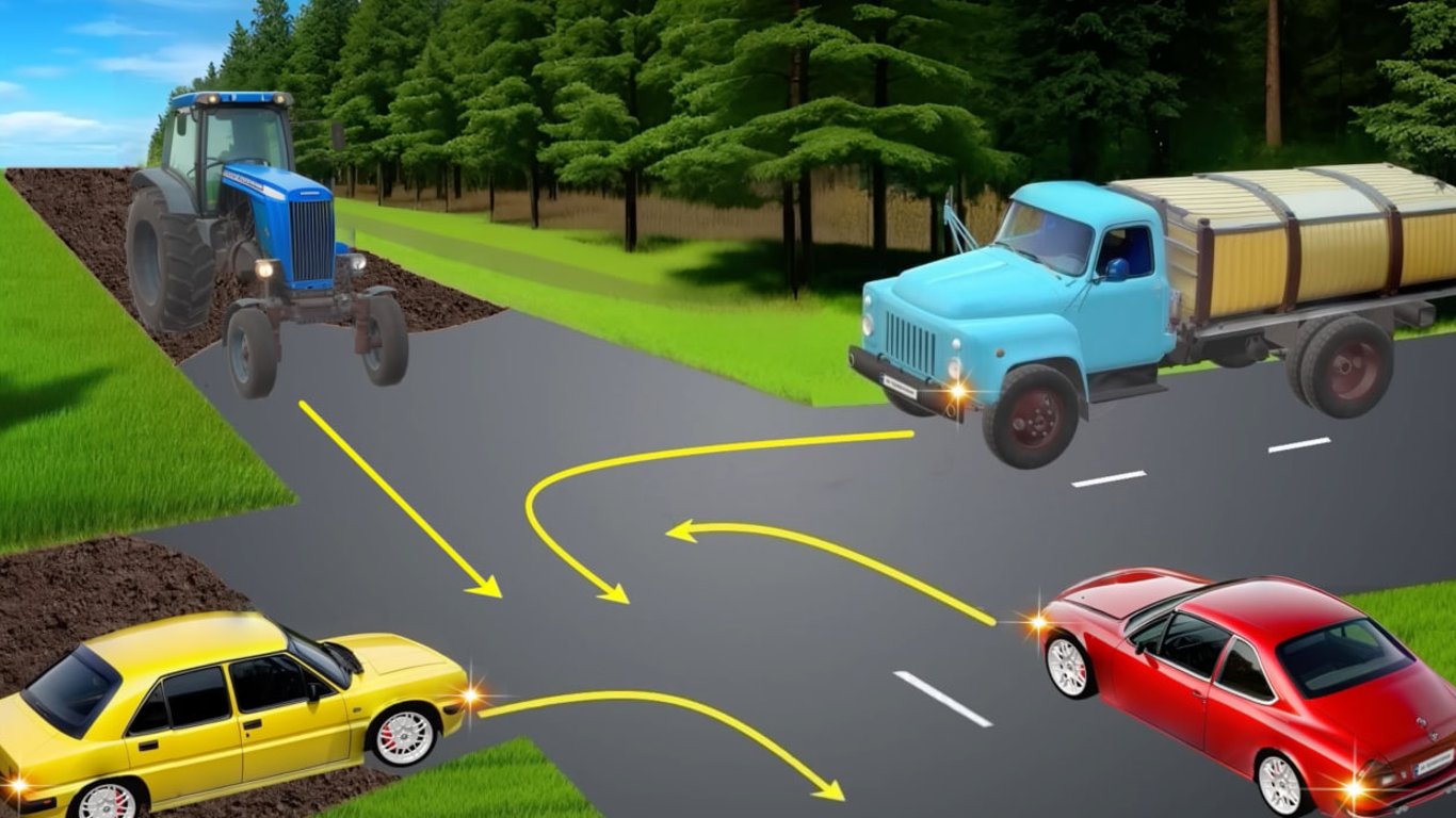 На перехресті водій вантажівки та червоного легковика повертають ліворуч, тракторист проїжджає прямо, а водій жовтого автомобіля повертає праворуч.