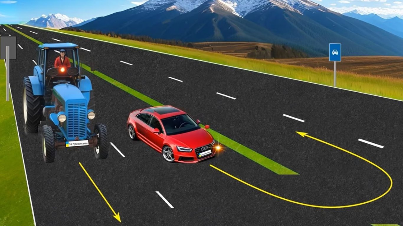 Водій трактора їде прямо, а водій червоного автомобіля має намір виконати розворот.