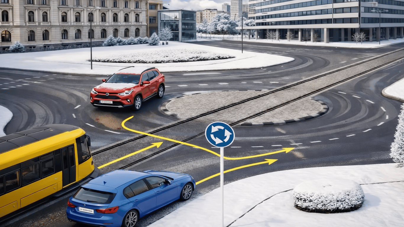 На перехресті встановлено дорожній знак 4.10 "Круговий рух". Водій червоного автомобіля вже рухається по колу, тоді як водії синього авто та трамвая лише в'їжджають на нього.