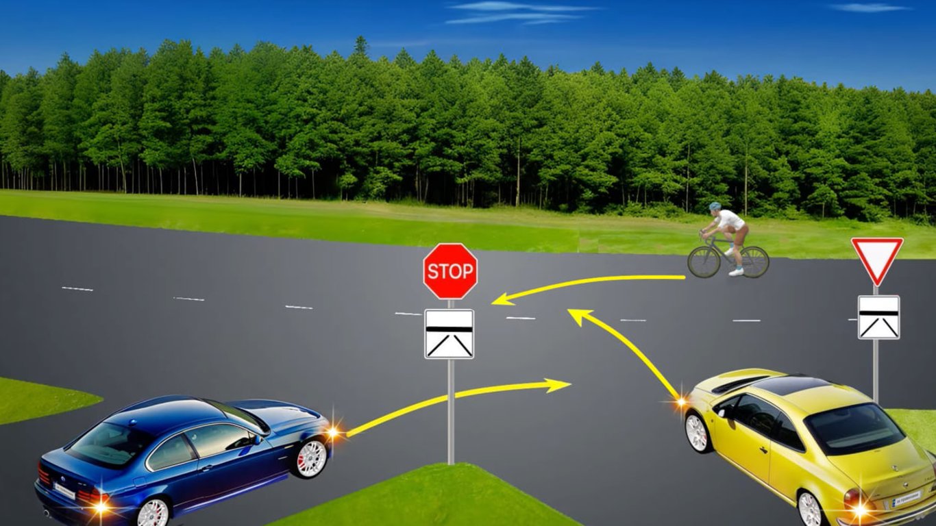 На перехресті велосипедист та водій жовтого автомобіля повертають ліворуч, а водій синього — праворуч.