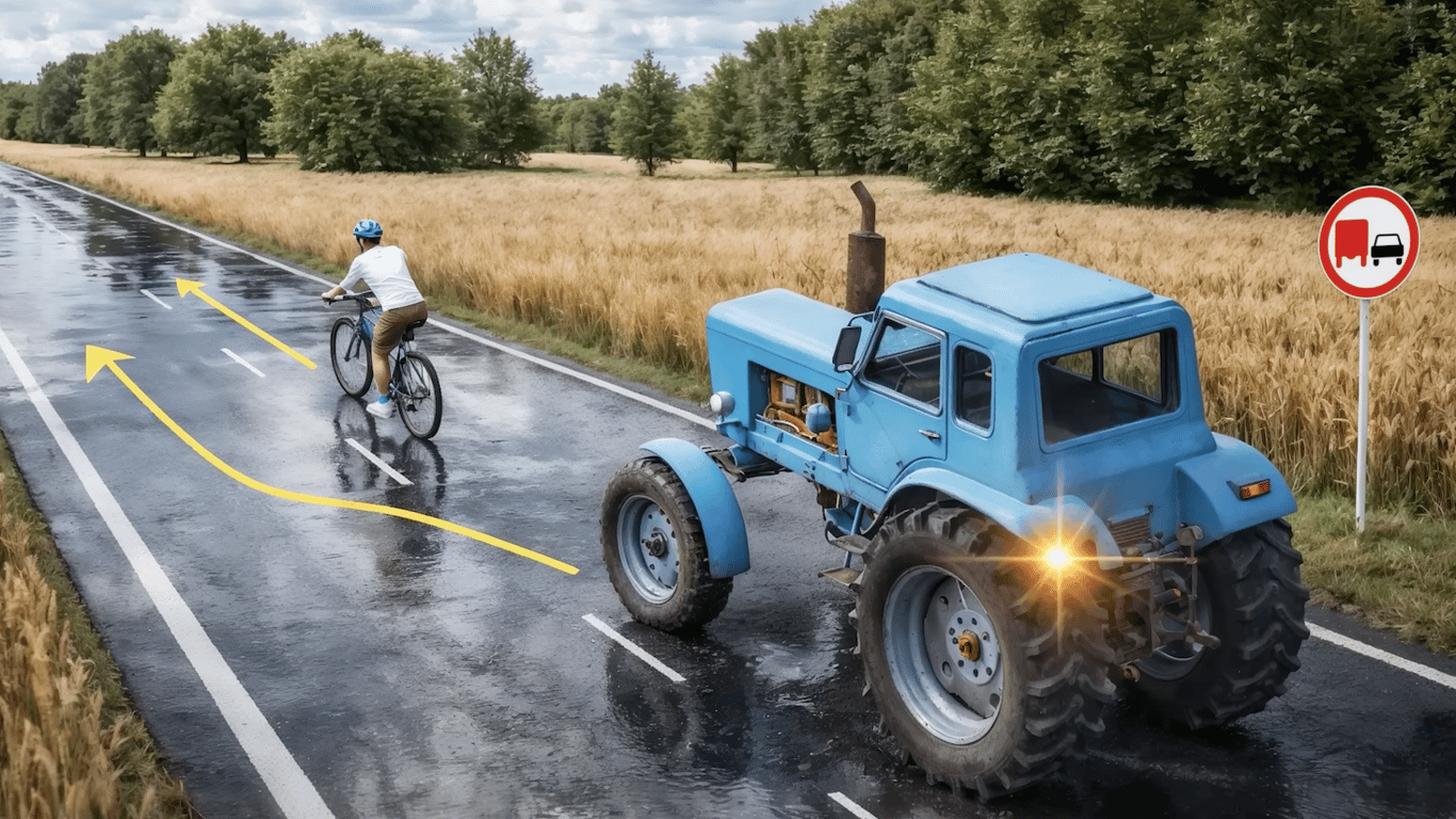 Задача на знання заборонних дорожніх знаків. Чи дозволено водієві трактора обігнати велосипедиста у зображеній на малюнку ситуації?