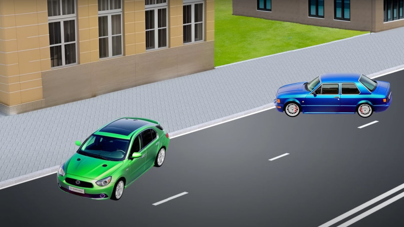 Водій зеленого автомобіля поставив машину під кутом задньою частиною, а водій синього — під кутом передньою частиною.