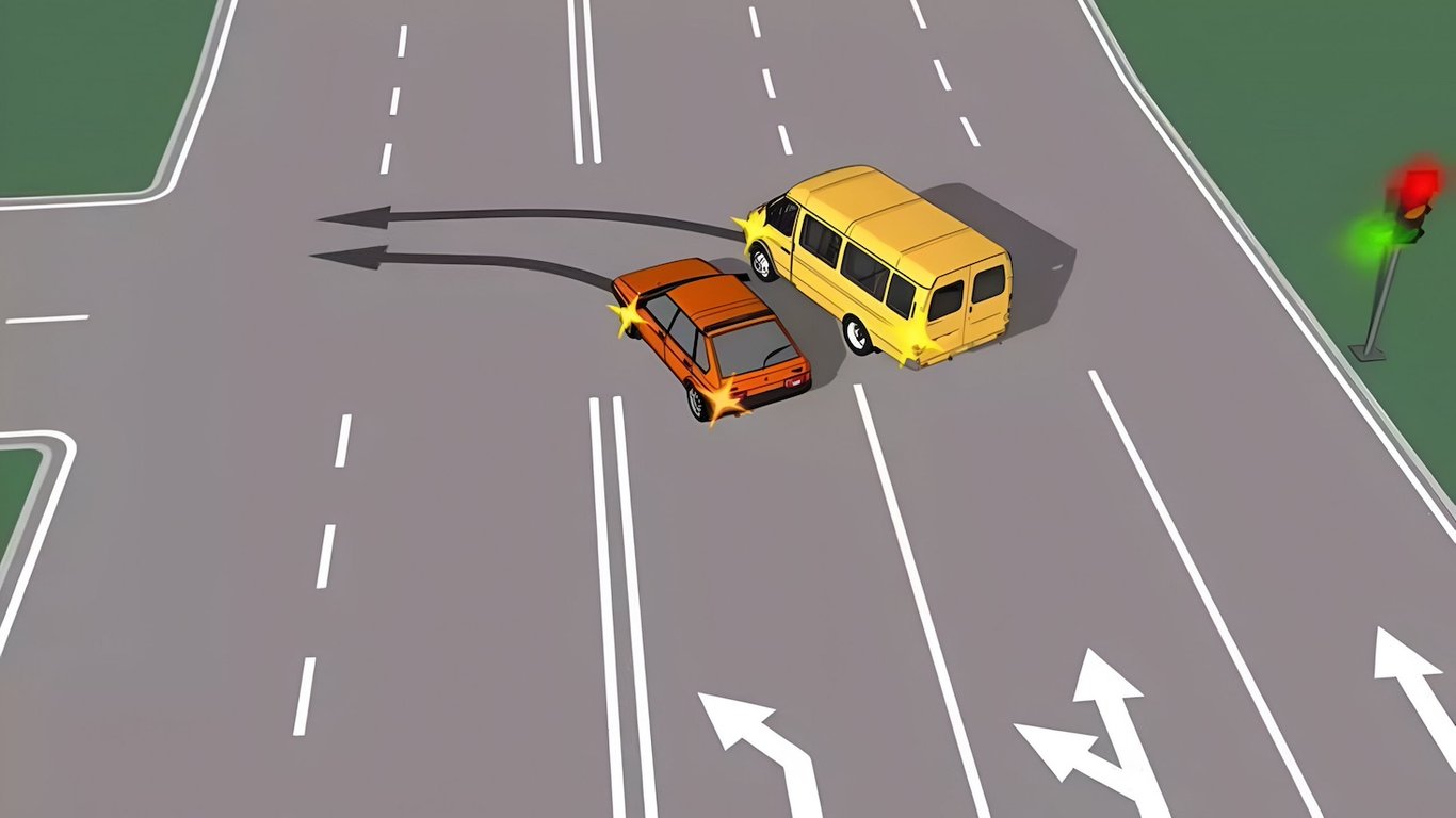 Задача з теми про початок руху та зміну його напрямку. Хто з водіїв зобов'язаний поступитися під час повороту ліворуч у зображеній на малюнку ситуації?