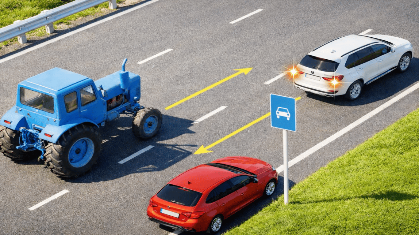 Задача з теми про рух по автомагістралях і дорогах для автомобілів. Водій якого транспортного засобу порушує правила у зображеній на малюнку ситуації?