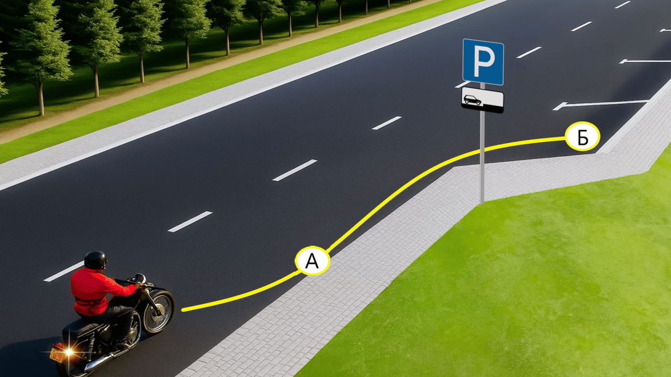 Мотоцикліст шукає місце для стоянки. Місце А — біля правого краю проїзної частини. Місце Б — спеціально відведене для стоянки, позначене знаком 5.42.1 "Місце для стоянки" з табличкою 7.6.4 "Спосіб поставлення транспортного засобу на стоянку".