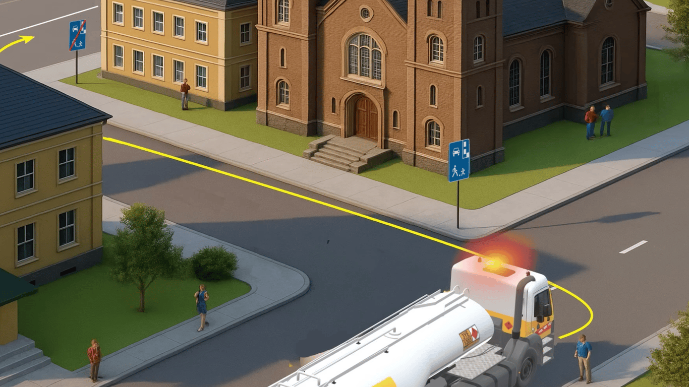 Водій великого бензовозу має намір потрапити на паралельну вулицю, проїхавши через житлову зону, яка позначена знаками 5.34 "Житлова зона" та 5.35 "Кінець житлової зони".