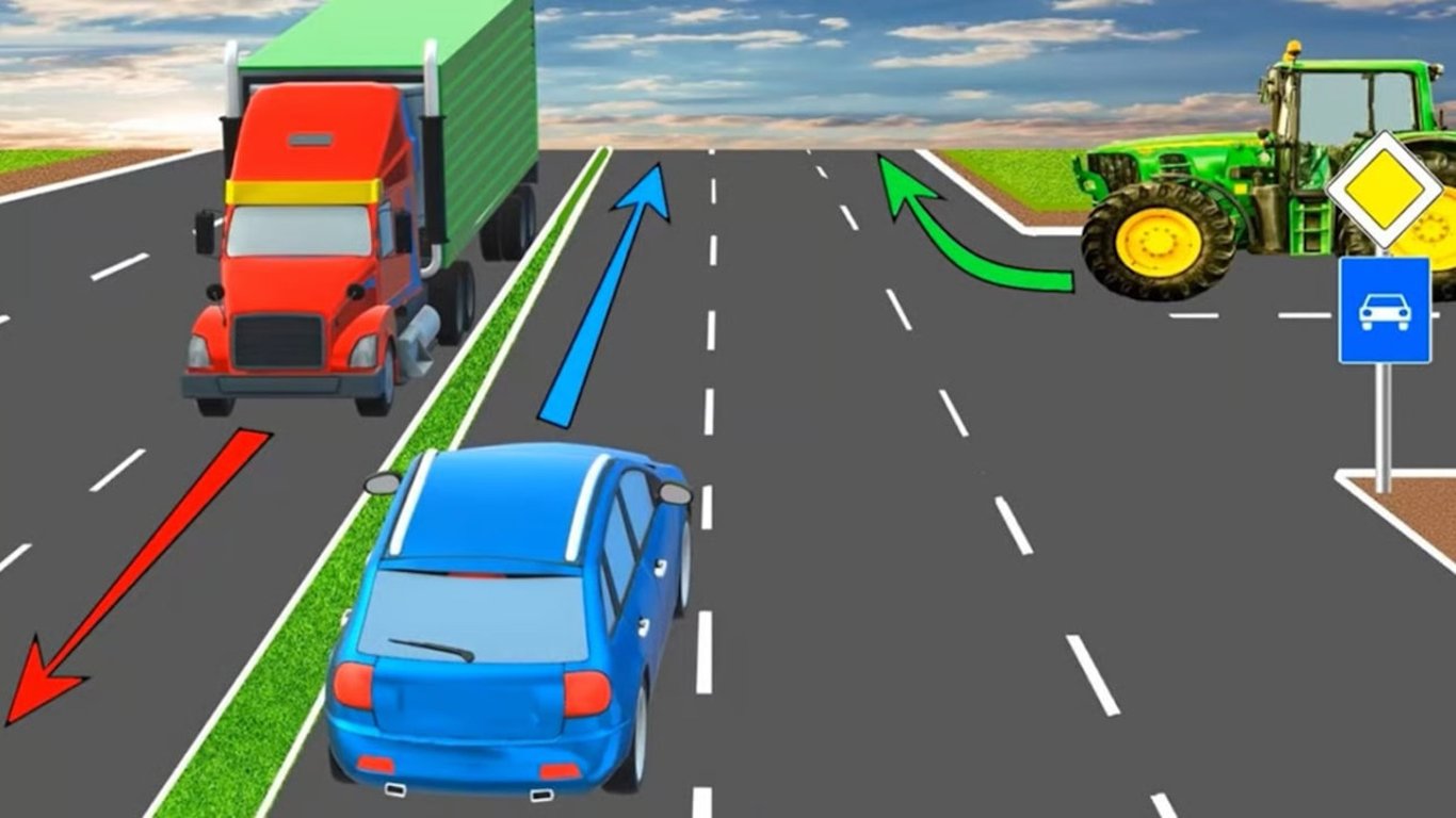 Отже, порушують правила тракторист, якому взагалі заборонена їзда на дорогах для автомобілів, та водій вантажівка, який їде по забороненій третій смузі.
