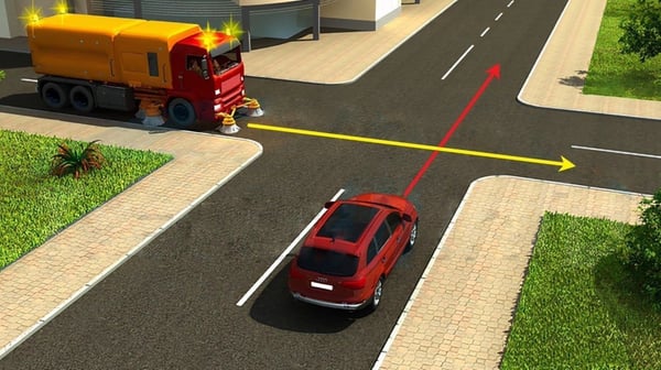 З правого боку до водія спецмашини наближається водій червоного автомобіля, який проїде перехрестя першим.