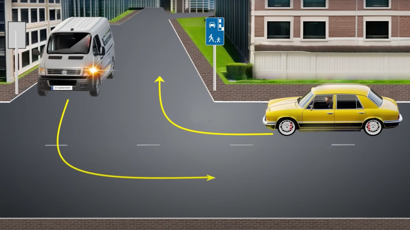 На ділянці дороги жовтий автомобіль повертає праворуч, в'їжджаючи до житлової зони, про що свідчить знак 5.34 "Житлова зона". Водночас водій сірої машини повертає ліворуч, виїжджаючи з цієї зони.