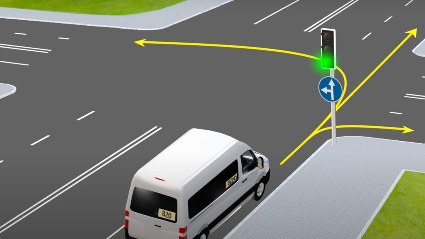Тест на знання дорожніх знаків та з теми про початок руху та зміну його напрямку. Куди дозволено продовжити рух водієві маршрутки в зображеній на малюнку ситуації?