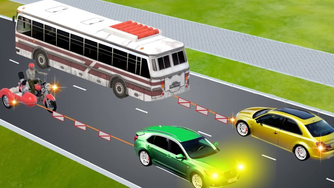 По дорозі водій автобуса буксує жовтий автомобіль, а водій зеленої машини — мотоцикл з боковим причепом.
