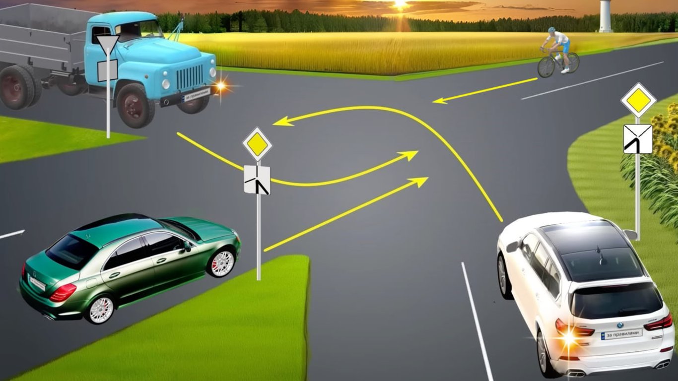 Згідно зі знаками 2.3 "Головна дорога" та 7.8 "Напрямок головної дороги", зелений та білий автомобілі знаходяться на головних дорогах, тому їхні водії мають перевагу перед велосипедистом та водієм вантажівки.